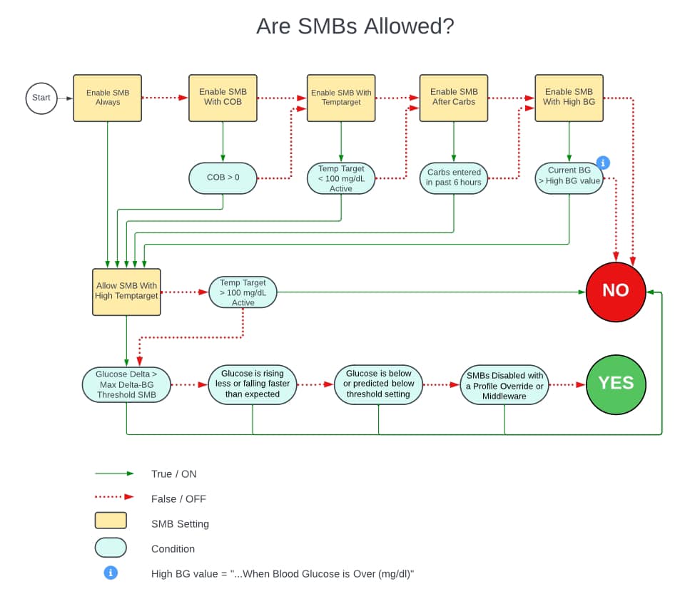 - If "Allow SMB with High Temptarget" is toggled on (NOT the default), then continue to follow the green line to the bottom conditions.