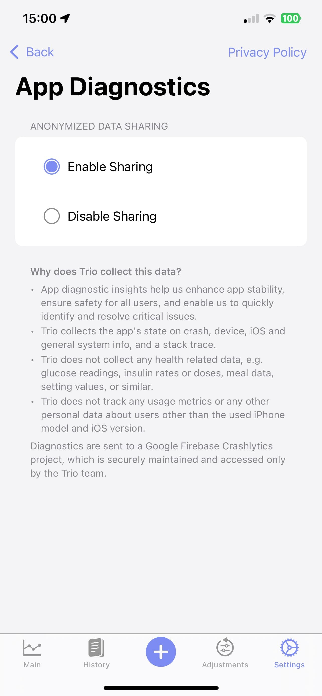 When activated, Trio’s App Diagnostics feature automatically captures anonymized crash reports so the developers can keep the app stable and safe.