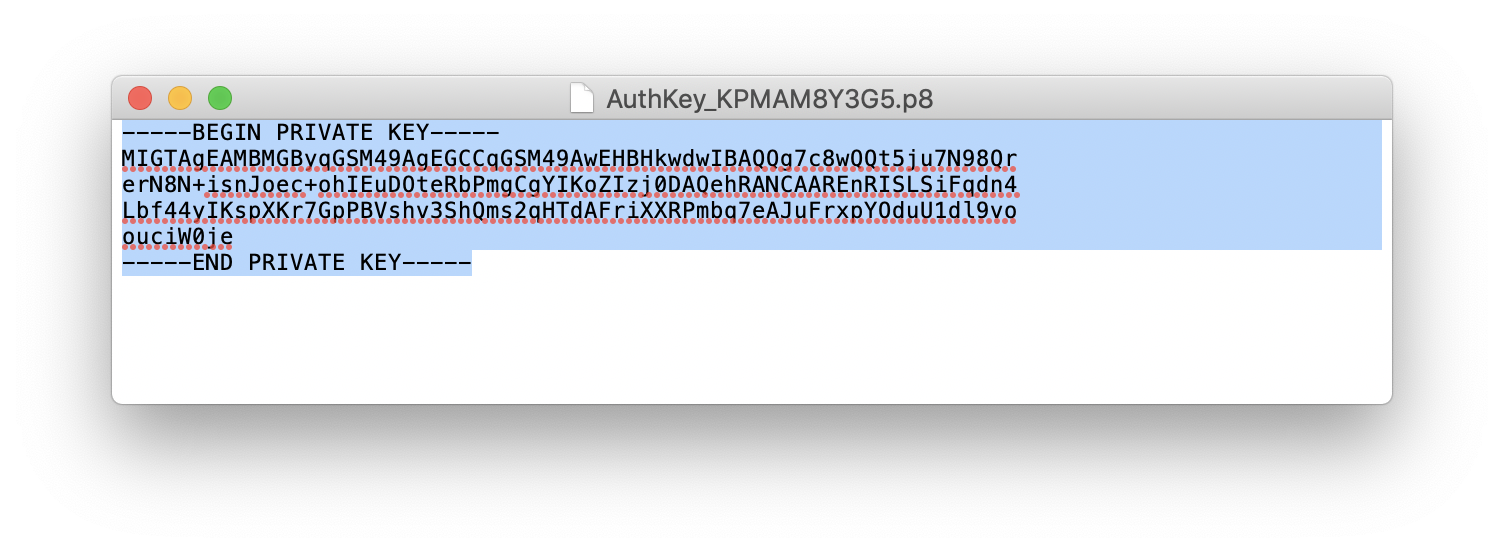 AuthKey_AAAAAAAAAA.p8.txtfile. It will look similar to the screenshot below. You need to highlight ALL OF THE CONTENTS of that file and copy it and then paste it both into your Secrets Reference file and into the row for LoopFollow APNS Key. Yes, allllll of the contents.
