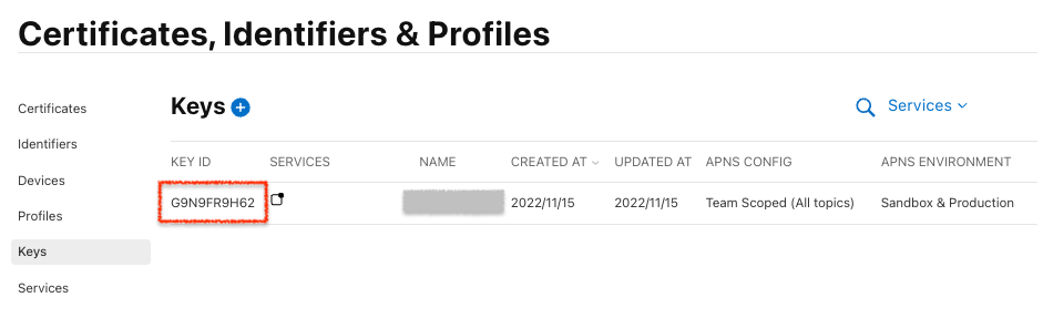 AuthKey_AAAAAAAAAA.p8.txt. You can also see it if you return to Apple Developer'sCertificates, Identifiers & Profilesas highlighted in this graphic. You copy that APNS Key ID and then paste it both into your Secrets Reference file and into the row for LoopFollow APNS Key ID