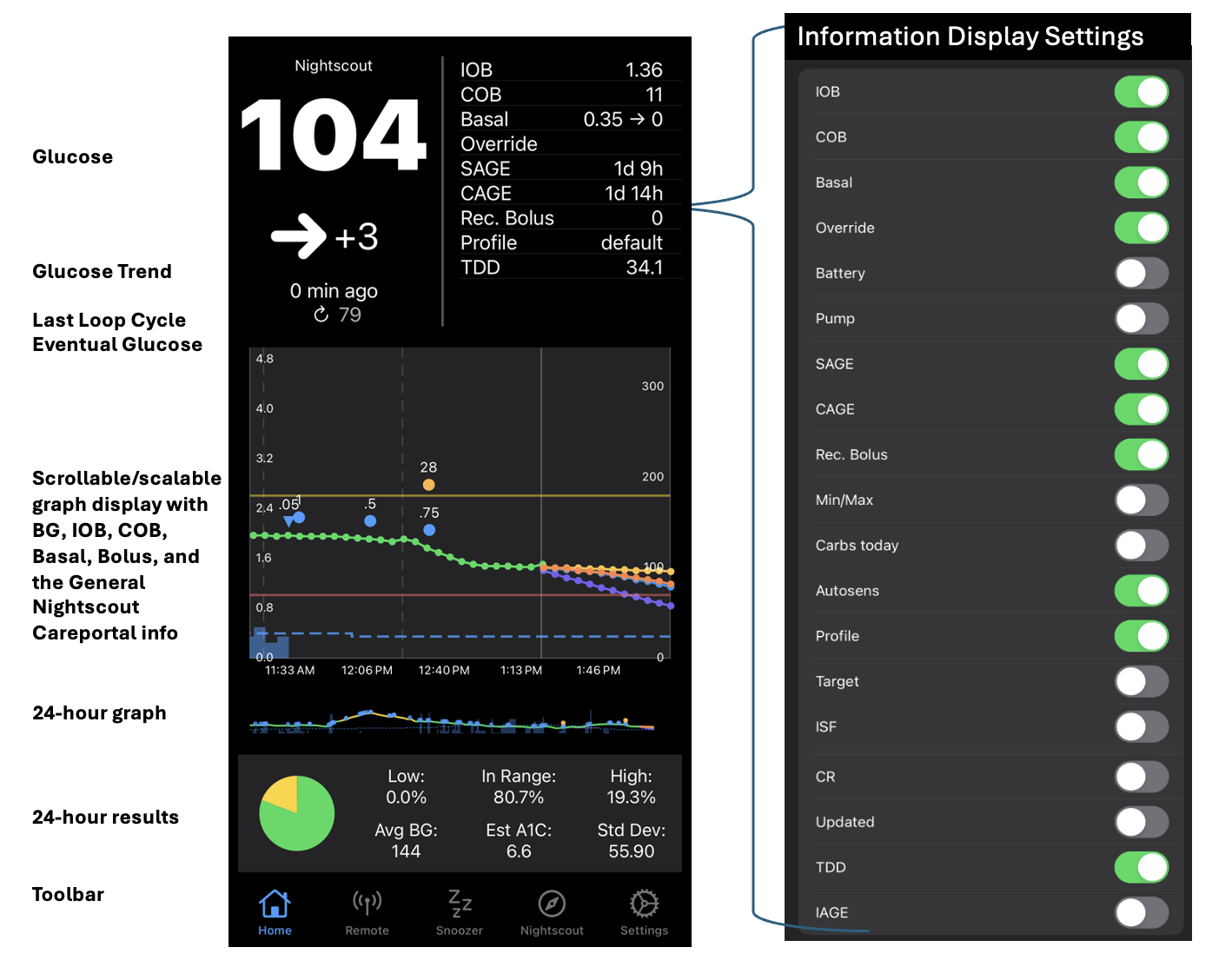 The graphic below shows the LoopFollow features on the main screen of the app.
