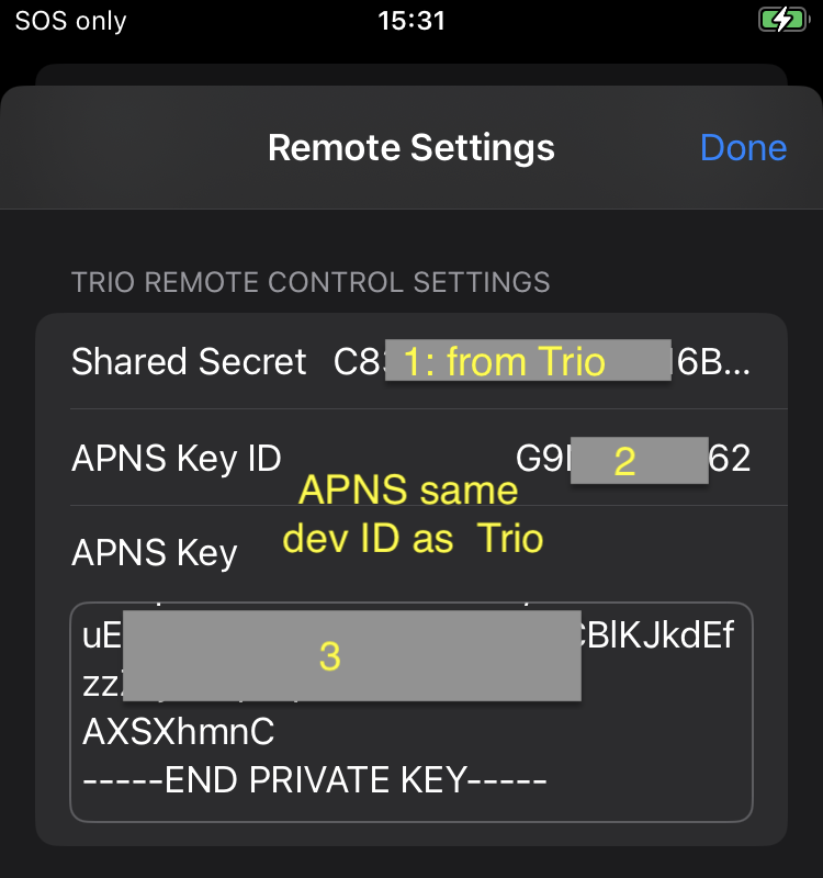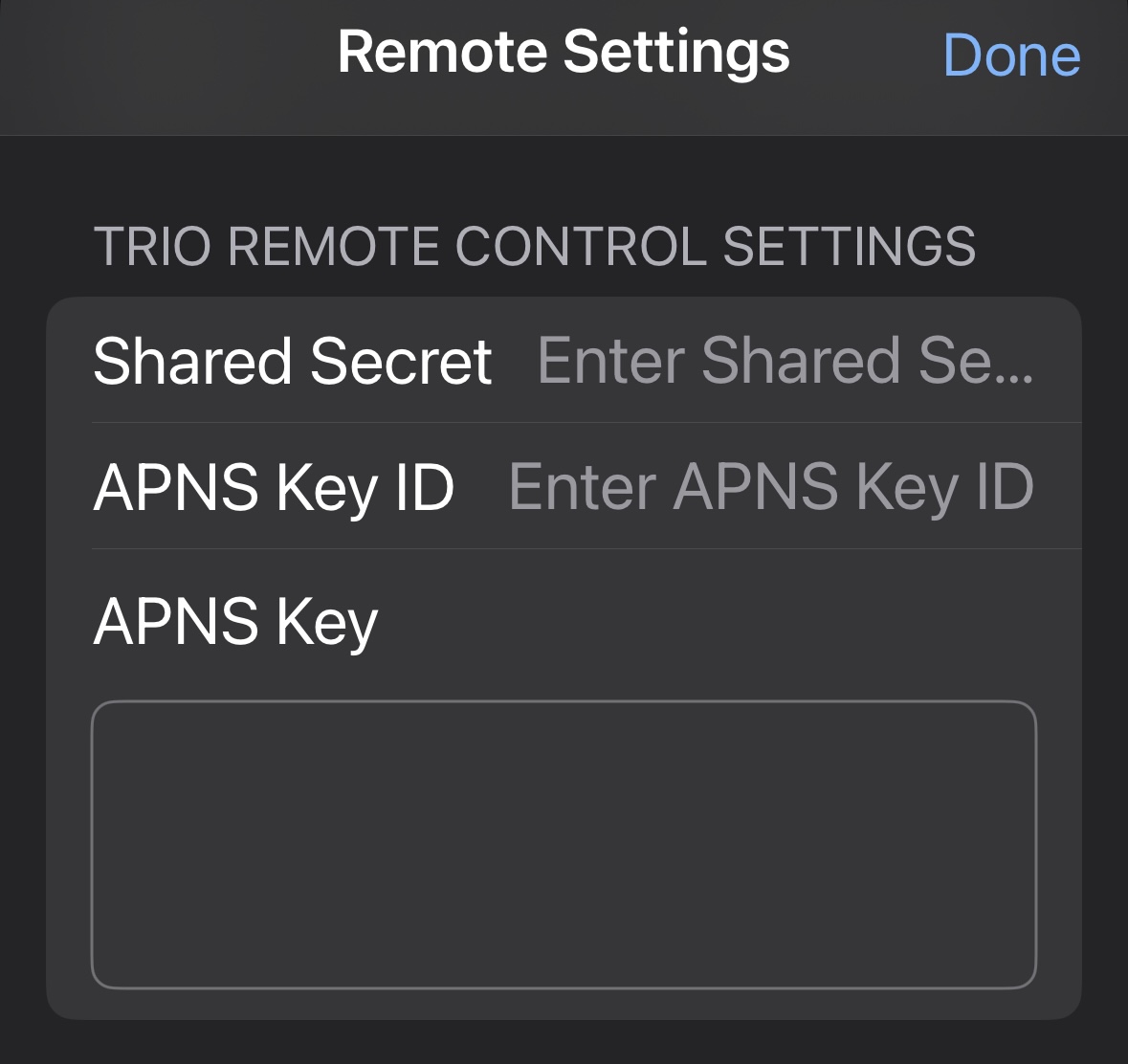 When you select Trio Remote Control as the Remote Type in the LoopFollow app, you must fill in the (1) Shared Secret, (2) APNS Key ID and (3) APNS Key.