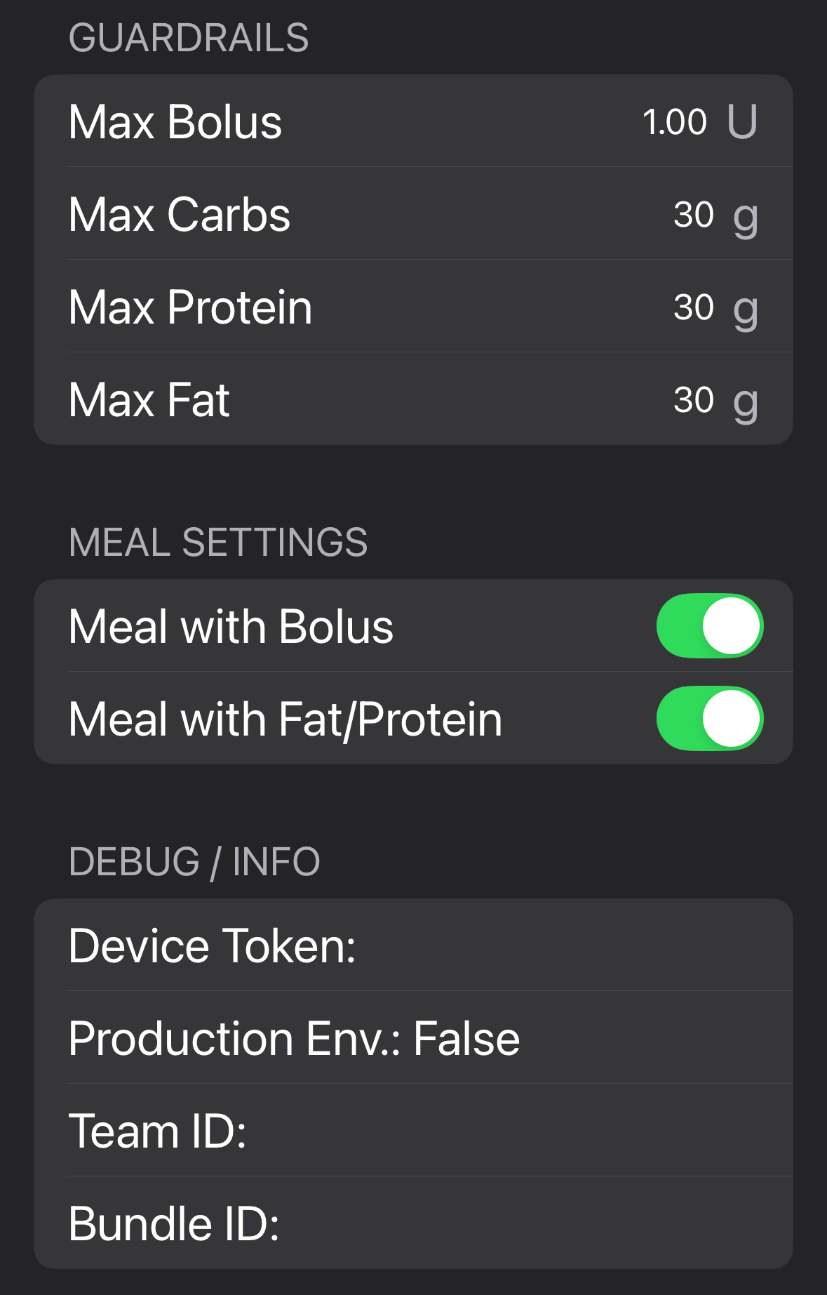 The maximum allowed entries for Bolus, Carbs, Protein, and Fat are configured in the guardrails section shown in the graphic below. This example is one in which the Shared Secret and APNS values have not yet been added.