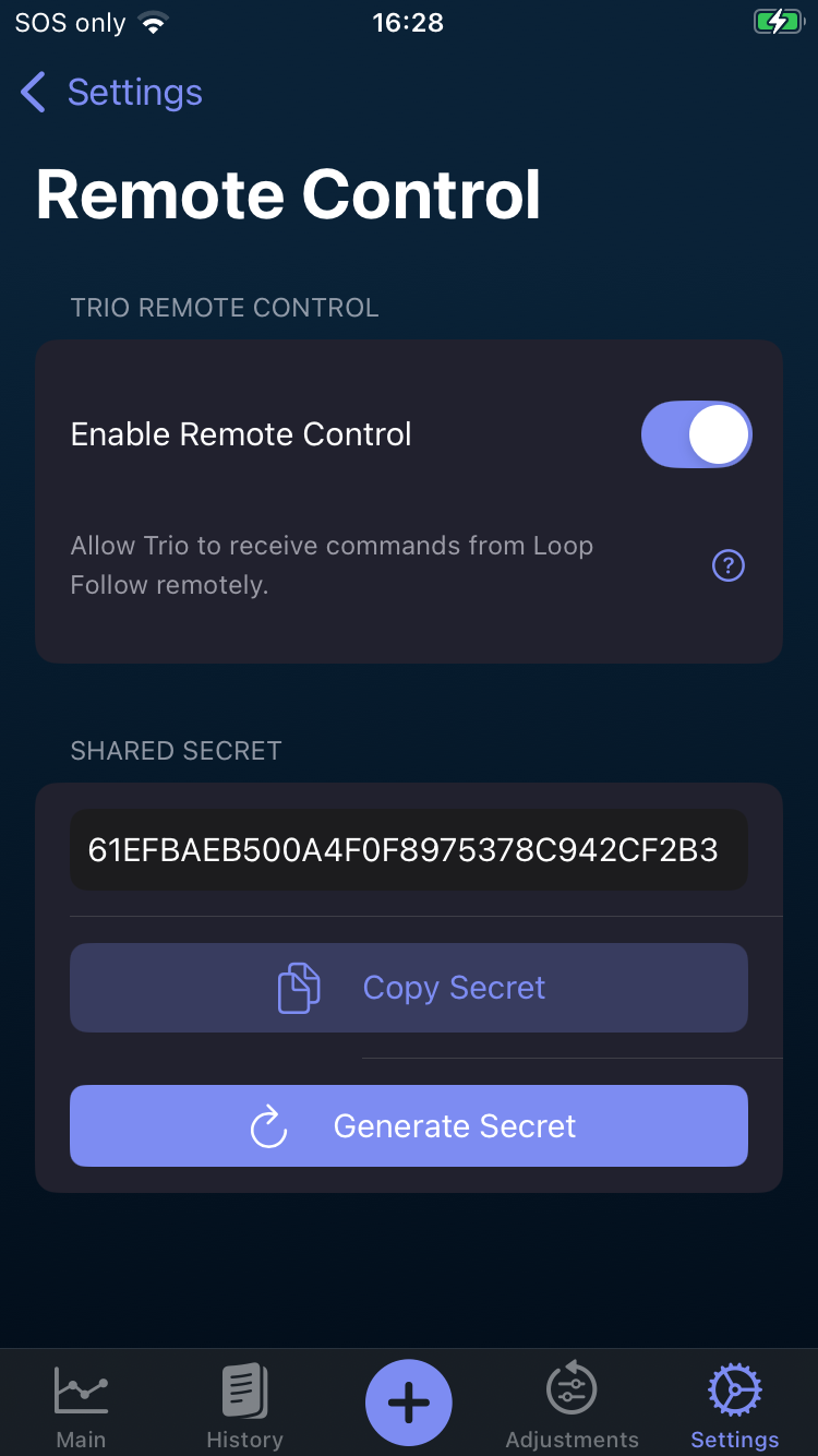 Once Remote Control is enabled, a Shared Secret is available. This is only used if you want to Configure LoopFollow Trio Remote Control.