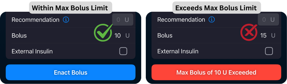 If you attempt to request a bolus larger than this, the bolus will not be accepted or proceed. So if your max bolus is set to 5U but you enter a 6U bolus, the "Enact Bolus" button will turn red and display a warning message. You will be unable to proceed until you lower your bolus to within this limit.