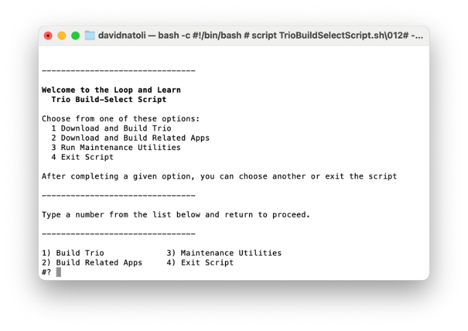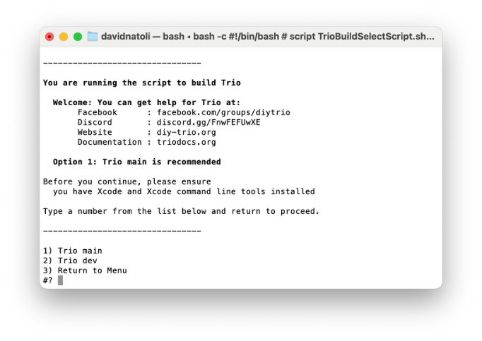 Running the script will display a series of menu options in the 'Terminal' window as shown below. To build Trio, you will type 1, and the press return.