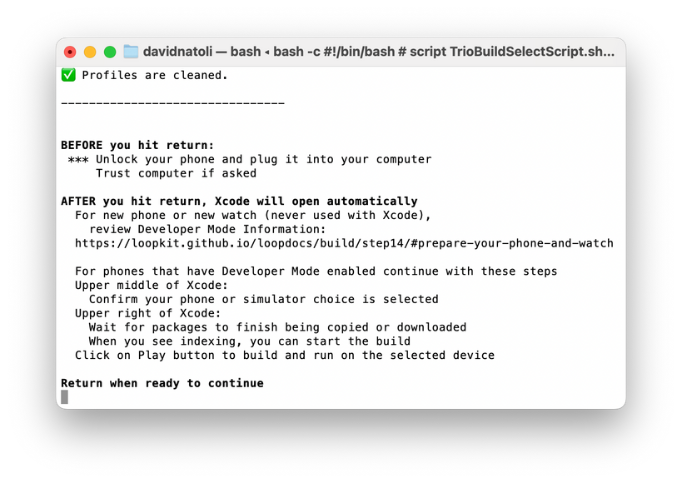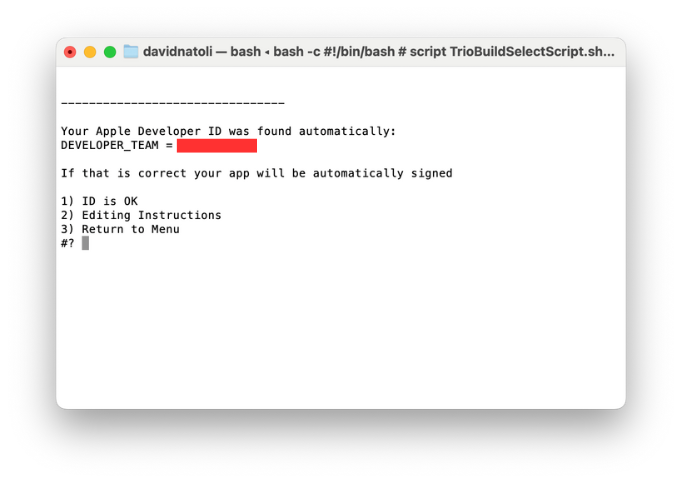 If you have previously built with the build script, you will be asked to confirm that your Team ID is correct. If it is, you can type 1 and press return.
