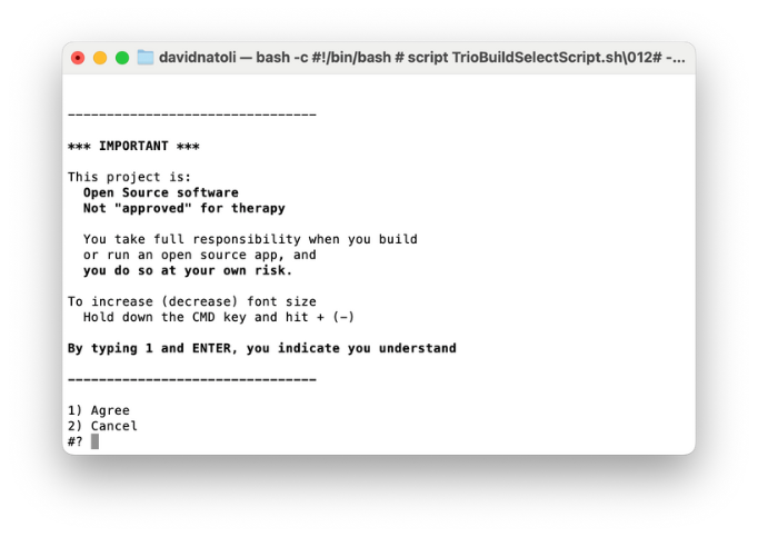 Next, the script will prompt you to select which Trio branch you want to download. Unless you are actively contributing to app development, you will type 1 and press return.