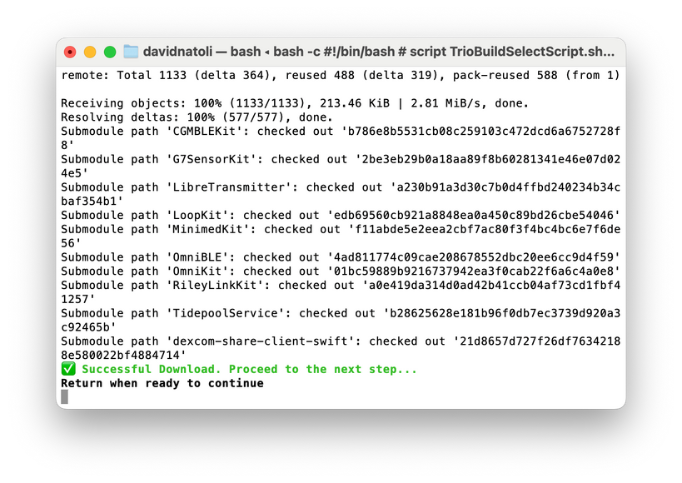 Next, the script will begin downloading the Trio source code. Depending on your download speed, this can take 3 minutes to 30 minutes. While this happens, you may read words in the Terminal window that you do not understand. That is normal. If the download takes a while, you can leave the room and return later to check progress.