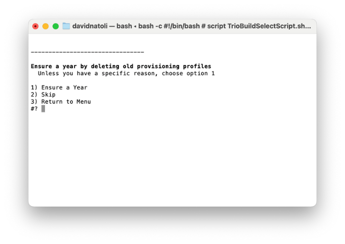 On the other hand, you may need to delete the provisioning profiles or saved Xcode information about a version of currently on your computer. The maintenance utilities found in the BuildSelectScrip can be run to delete your provisioning profiles or clear derived data. Or you can use the individual commands in the next sections to do the same thing.