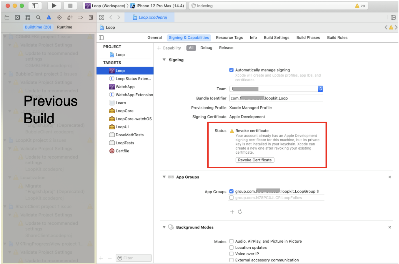 What does it look like if you run into the Revoke Certificate message? When you prepare to Sign the Targets with Xcode, you'll see the message highlighted in the figure below.