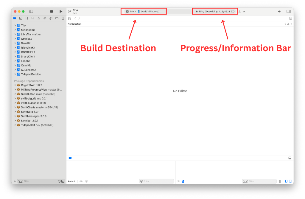 Once the build is complete, a transient message will appear on the window saying, "Build Succeeded." Trio will launch on your phone or build device. You can unplug the device from the computer. When you unplug the device, a message will pop up in Xcode noting the lost connection. Acknowledge this message. Once unplugged, the Trio app will close on the phone, and users must re-open the application.